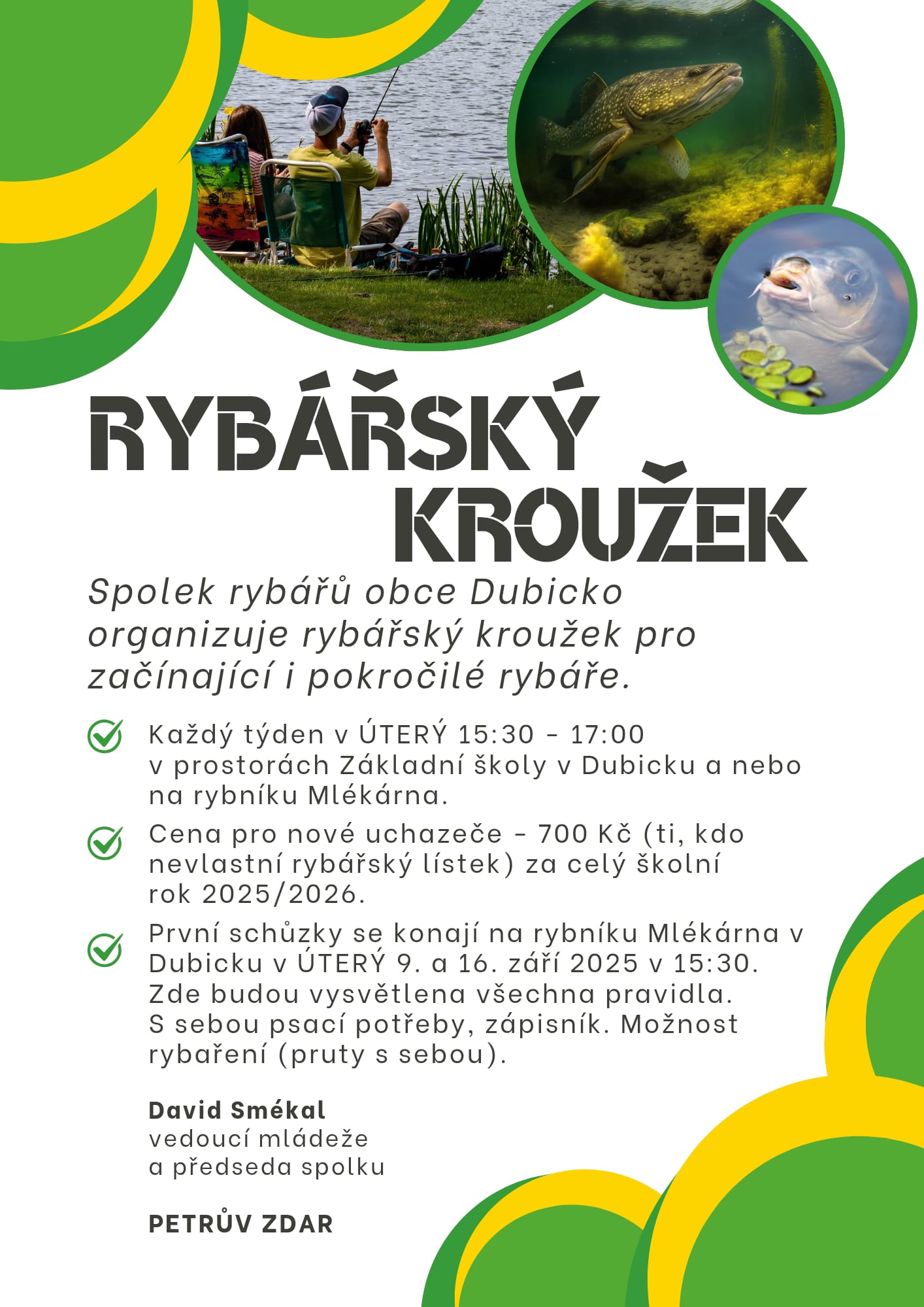 Spolek rybářů obce Dubicko organizuje rybářský kroužek pro začínající i pokročilé rybáře. Bližší informace jsou uvedeny v příloze.